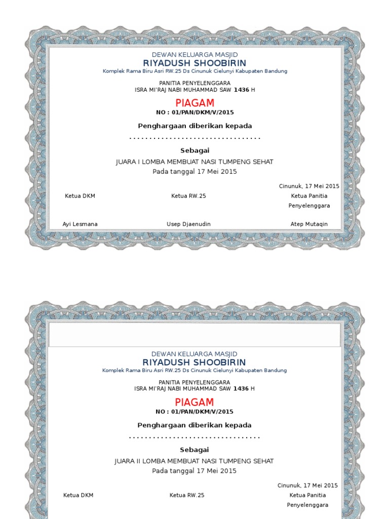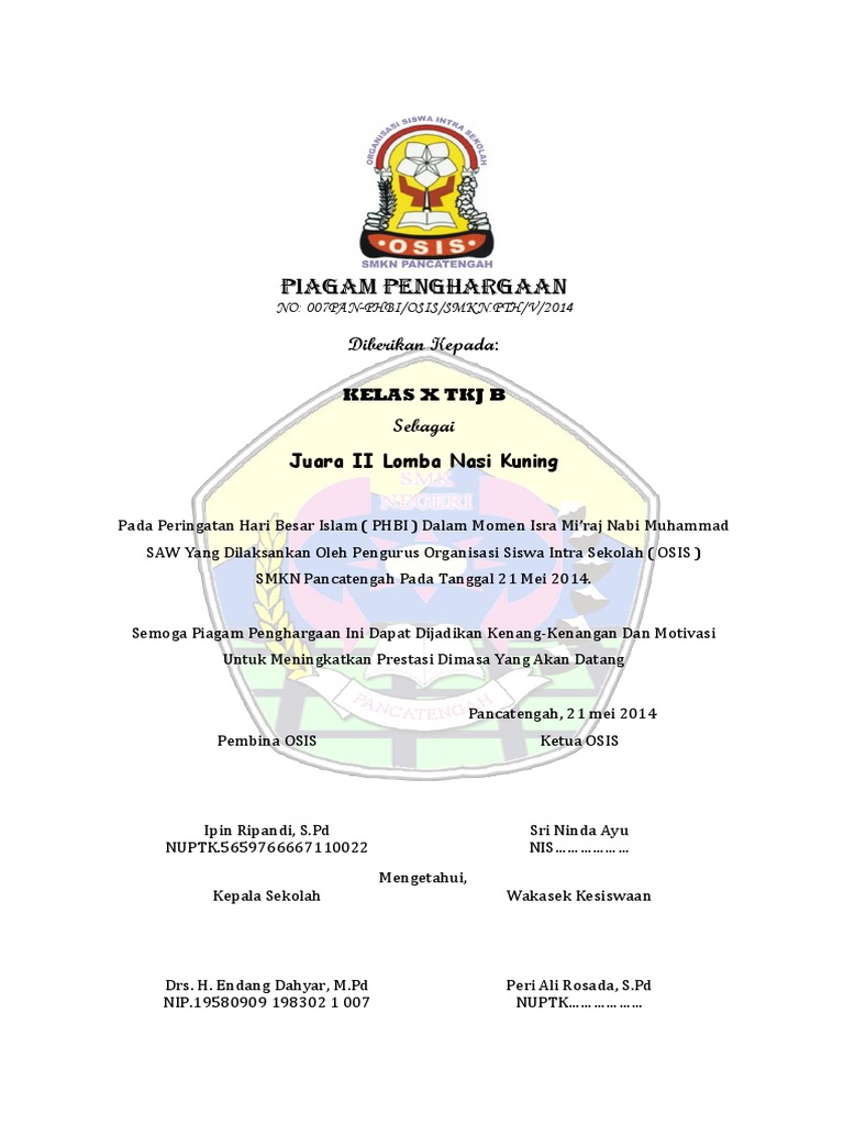 Contoh Piagam Penghargaan Lomba Kejuaraan Format Doc Pontren Com